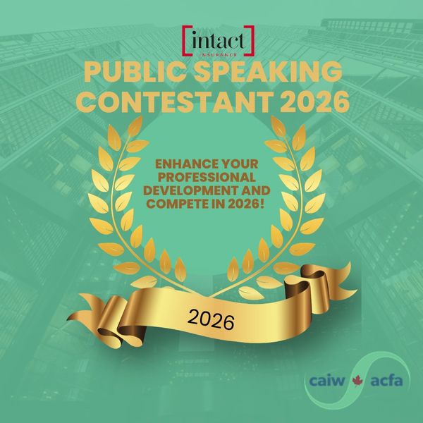I am pleased to announce Intact Insurance has extended their generosity once again and confirmed sponsorship for the National Public Speaking Contest to be held at CAIW Convention in Blue Mountain, Ontario. All Associations are encouraged to participate in order to make this event, which is always a highlight of Convention, a success. Please find topics below, rules and regulations, and entry form were sent to Association Directors.. Deadline to return entry forms to the undersigned is