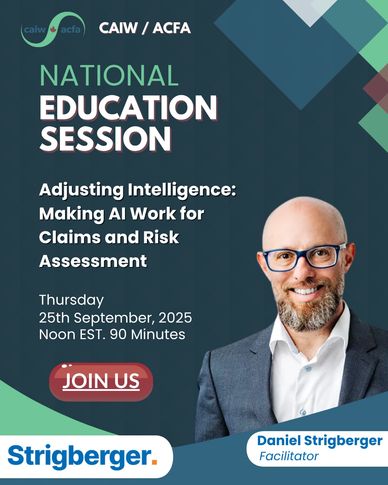 Join Us for an education session with Daniel Strigberger - Adjusting Intelligence : Making AI Work for Claims and Risk Assessment. AI is changing the insurance industry - but not always in the ways we expect. In this session, Insurance coverage lawyer Daniel Strigberger will demystify artificial intelligence, explain how and why it's being used in claims and risk assessment, and highlight the practical benefits and real-world risks. Please register below - You must be a member of CAIW to attend this event